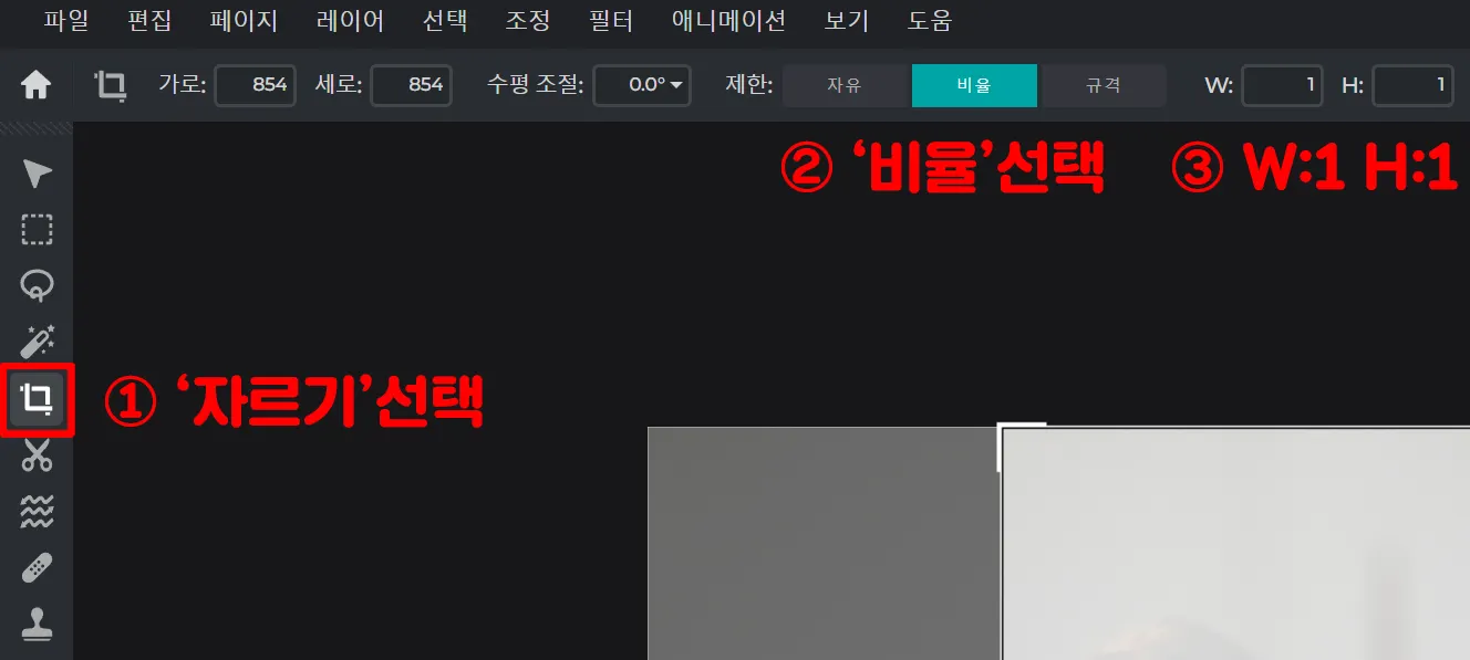 제한: 비율 / W:1 H:1 (1:1비율로 설정)